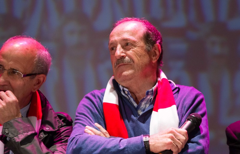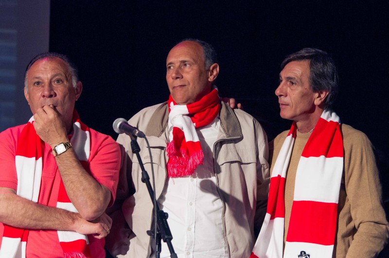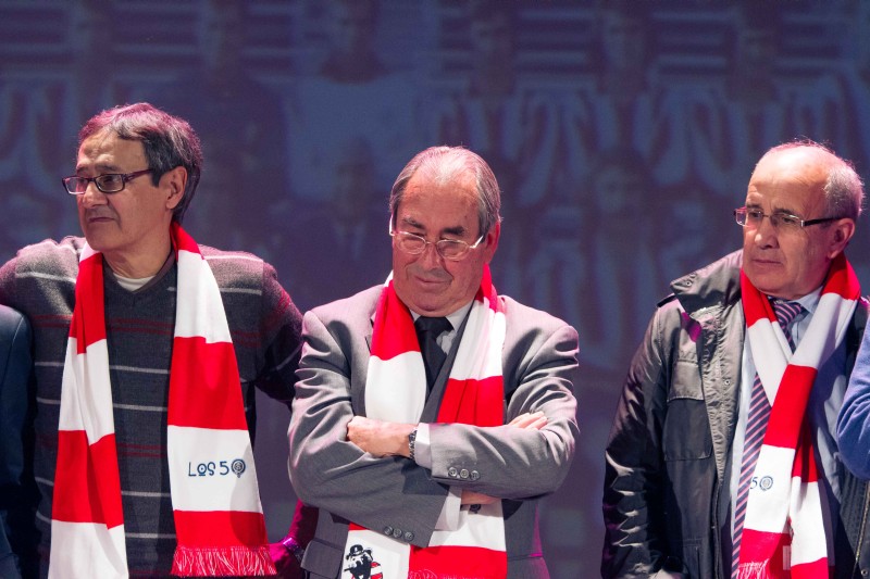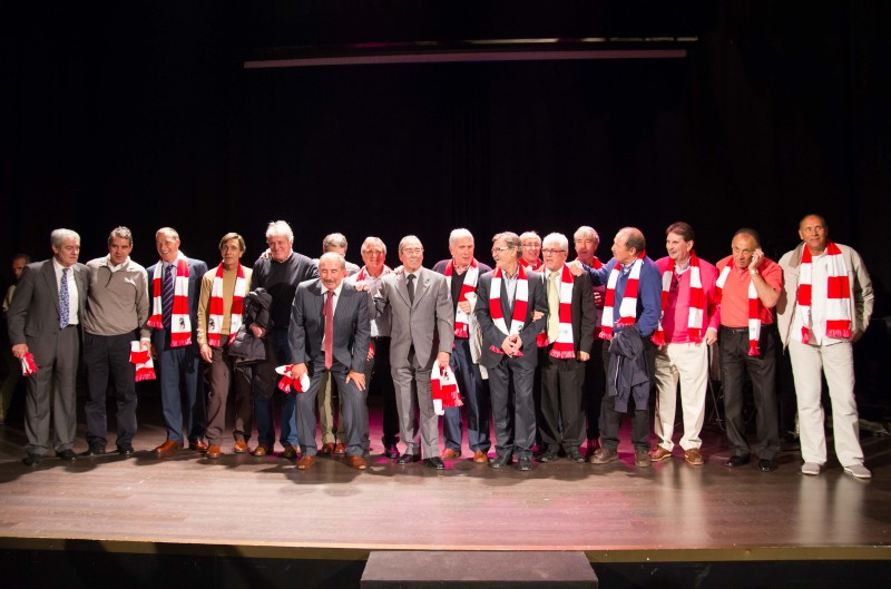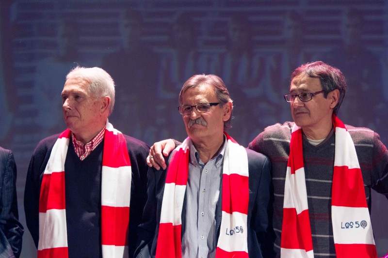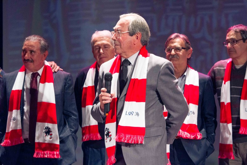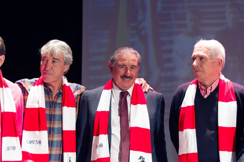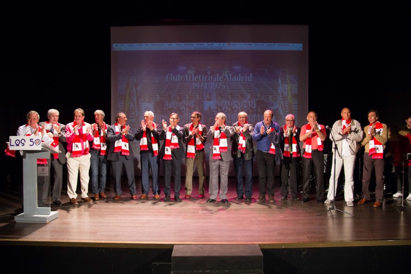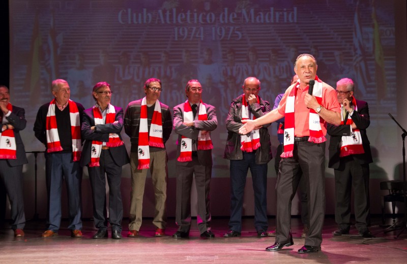 Y todos juntos llegamos a 1975. Por supuesto volando, como correspondía al acto. Entonces, la gran pantalla de fondo proyectó la foto. Esa foto. La de los héroes del 10 de abril de 1975. Salió al escenario nuestro Vicepresidente, José Antonio Martín Otín “Petón”, que dando paso uno a uno a Pacheco, Eusebio, Alberto, Adelardo, Aguilar, Irureta, Ayala, Salcedo, Panadero Díaz, Benegas, Marcelino, Leal, Laguna, Fraguas y Baena, componentes de aquél equipo de leyenda quienes, junto a los hijos de Luis Aragonés y Heraldo Becerra, que nos han concedido el lujo de convertirse en amigos para siempre y suplieron de modo ideal, ausencias tan sentidas, y de Pepe Navarro, persona imprescindible cuando se habla de ex-jugadores atléticos, nos fueron desgranando sus recuerdos.