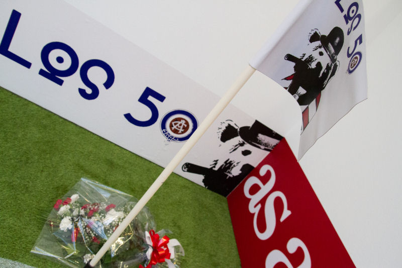 Y allí, en la Casa del Reloj del Matadero, quedará hasta el 8 de abril ese resumen de cincuenta años de emociones con que Los 50 hemos querido celebrar las bodas de oro de nuestro templo. Conviene ir a verlo, a despertar los recuerdos, a seguir vertiendo al cauce del rio emociones pasadas y presentes. Si no lo haces, te arrepentirás, porque en unos meses, ese rio ya nunca volverá a ser el mismo, será más inerte, tibio, un falaz gran rio. Le faltará la vida que le derrama su afluente más vital, un afluente de roído ladrillo y frio hormigón que se nutre del caudal que brota de cincuenta y cinco mil neveros de pasión.